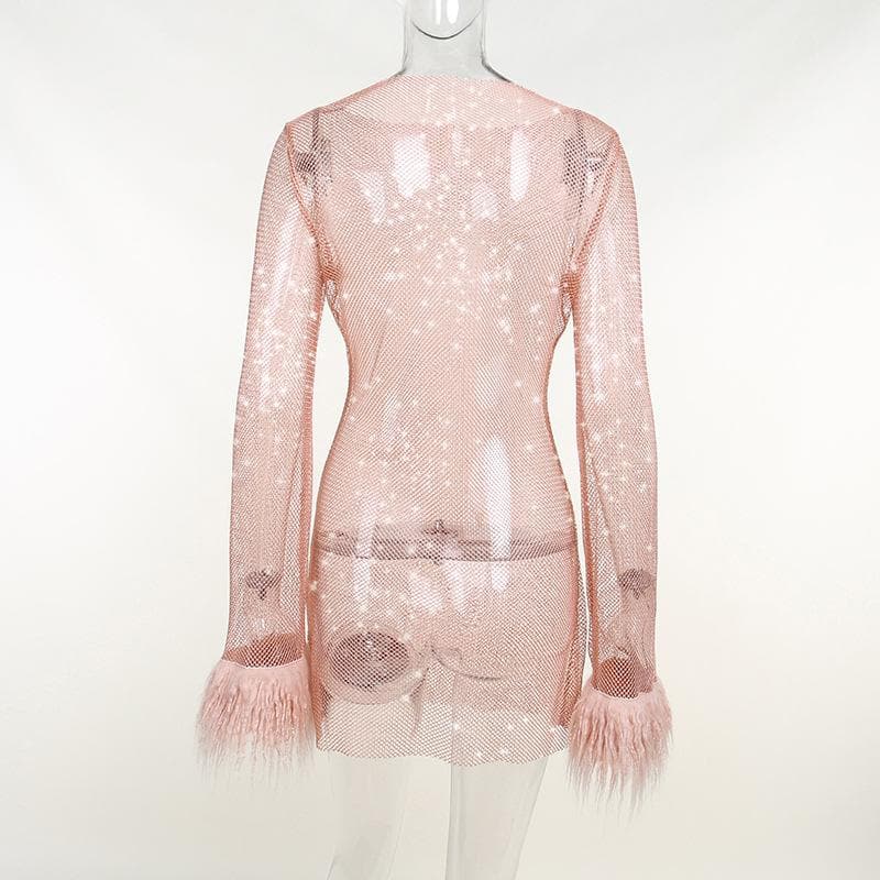 Long sleeve solid see through sheer mesh fluffy round neck mini dress