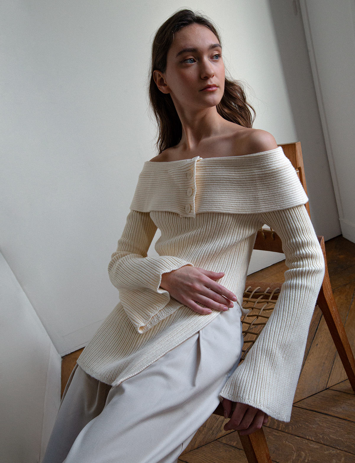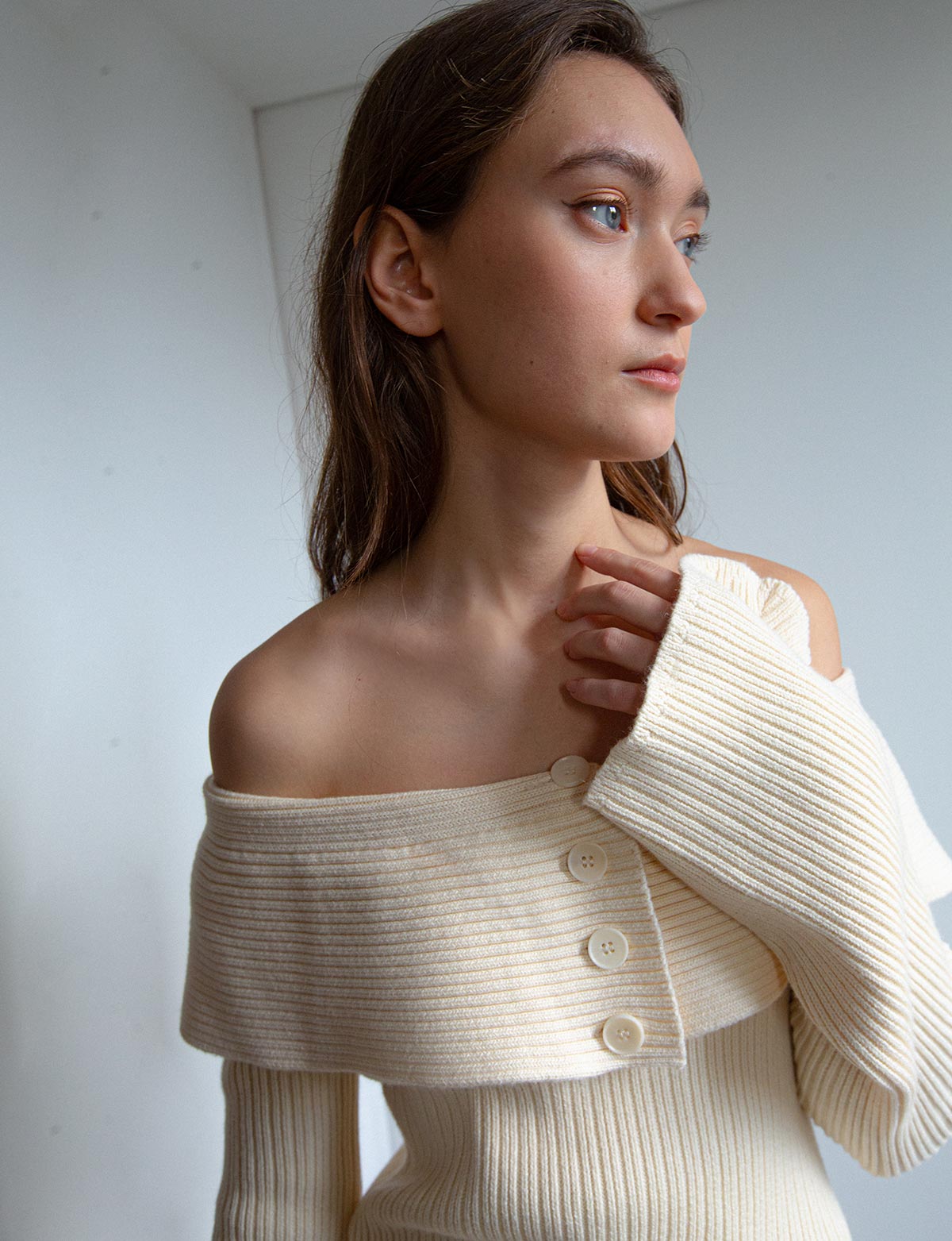 Chic off the shoulder knit top with button front and side slit .